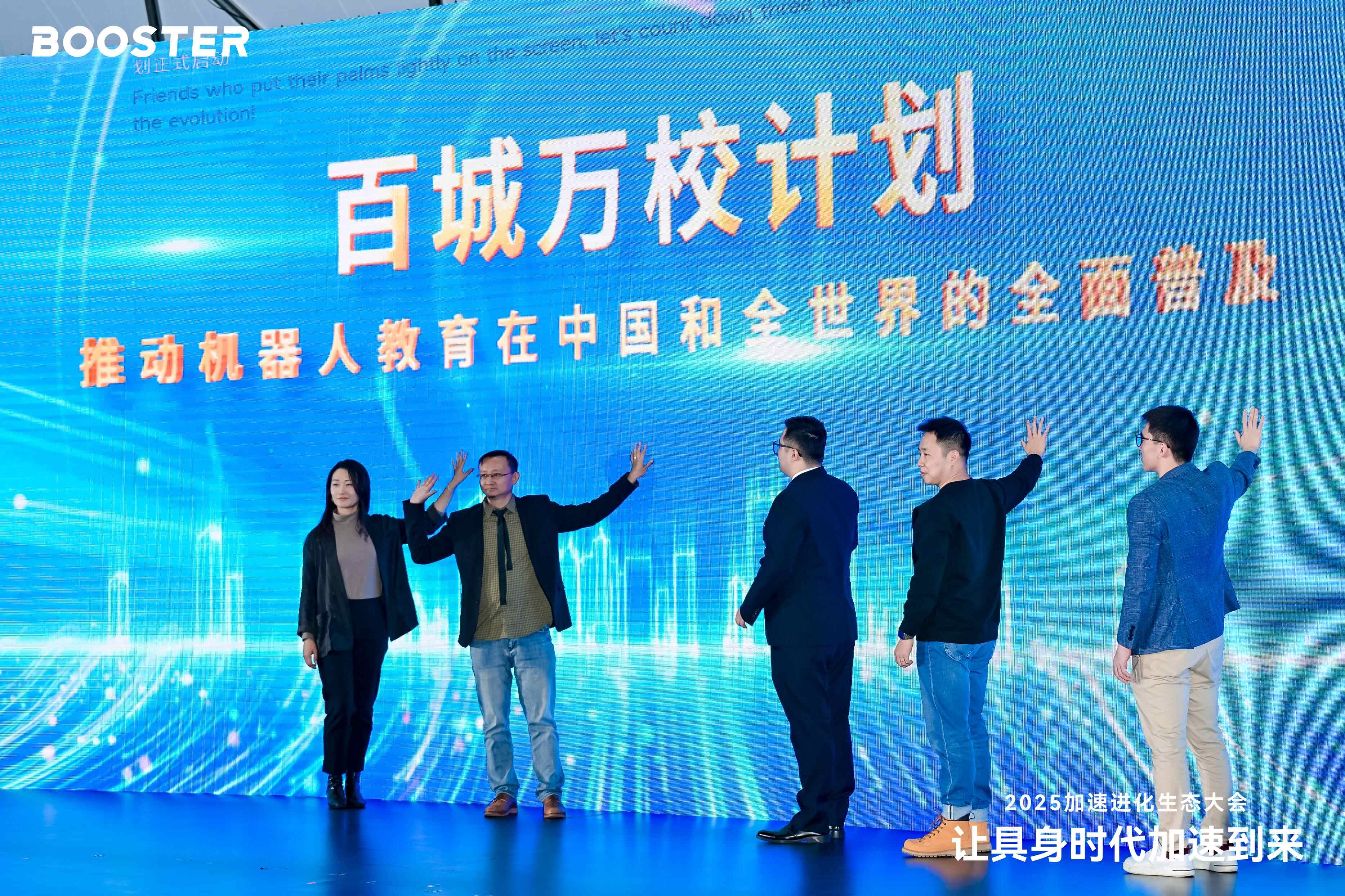 在大会现场,加速进化还发布了“百城万校”计划——在未来3年,加速进化将会和1000+高校、2000+职业学校、7000+中小学进行课程合作,推动机器人教育在中国和全球的全面普及。
