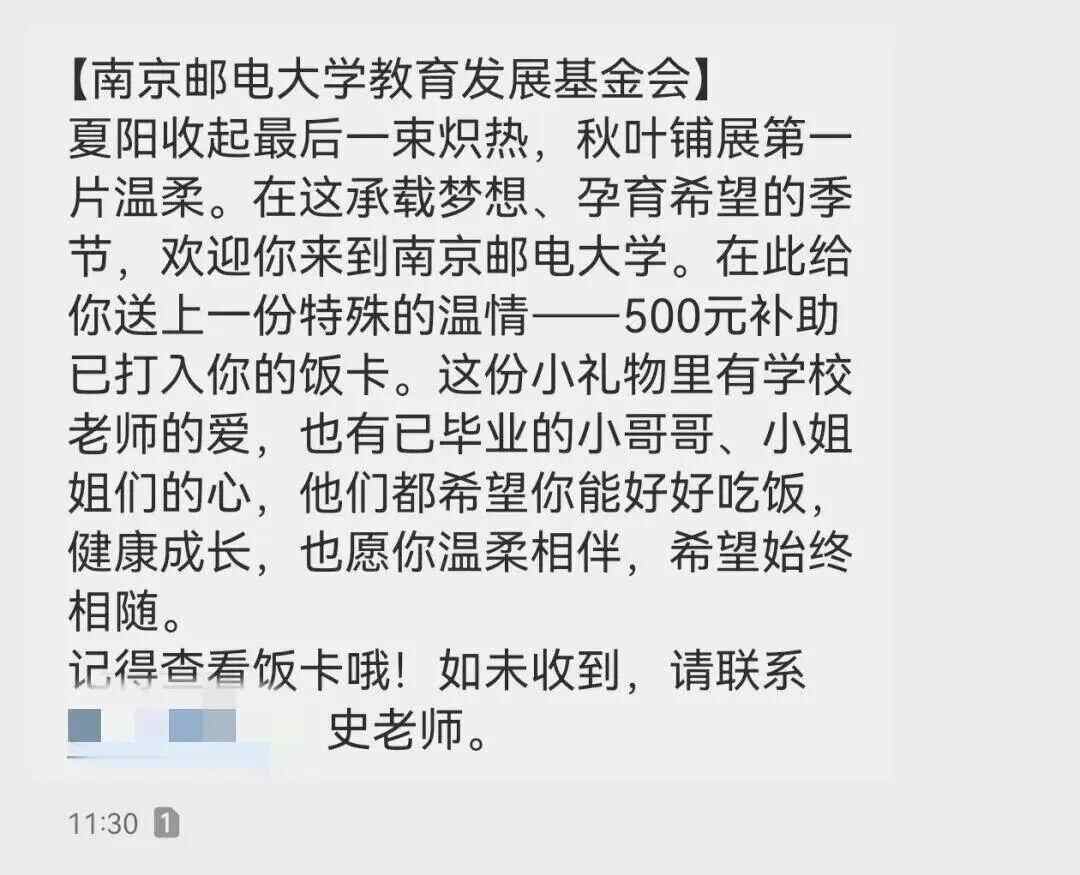 “在这承载梦想、孕育希望的季节,欢迎你来到南京邮电大学。在此给你送上一份特殊的温情——500元补助已打入你的饭卡。”10月21日,部分2025级新生收到了一条短信,这份温暖“静静到来”,没有预告,没有声张。