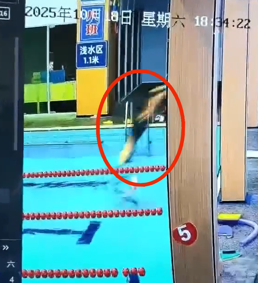 视频显示,监控时间10月18日18时34分21秒,一男子以头和双臂向下的姿势,从池沿跳入泳池中,随后栽倒。很快他就站了起来,并弯腰趴在水面上,动作僵硬,旁边一个小孩疑似在呼唤他,没有回应。至18时34分51秒视频结束,现场没有其他人员过来救助男子。该处泳池边的柱子上,有标牌注明“浅水区 1.1米”。