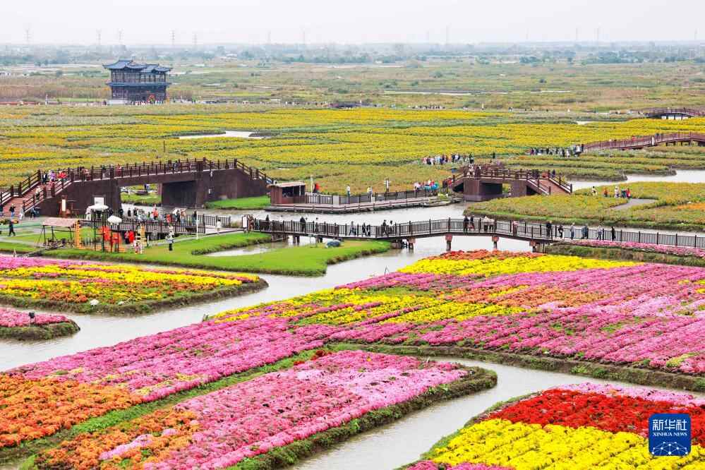 10月17日,游客在江苏省兴化市千垛景区赏菊游玩(无人机照片)。