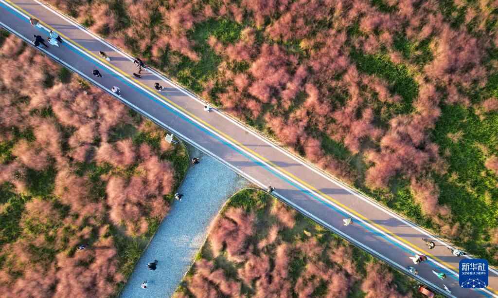 10月18日,游客在山东省东营市东营区耿井湿地粉黛乱子草“花海”拍照打卡(无人机照片)。