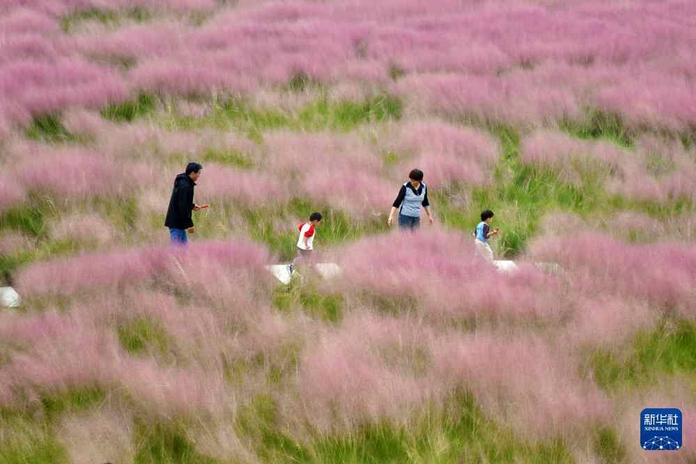 10月17日,游客在山东省烟台市黄渤海新区海螺广场粉黛花海游玩。