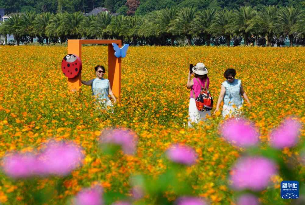 10月18日,游客在浙江省乐清市清江镇北塘村赏花拍照。