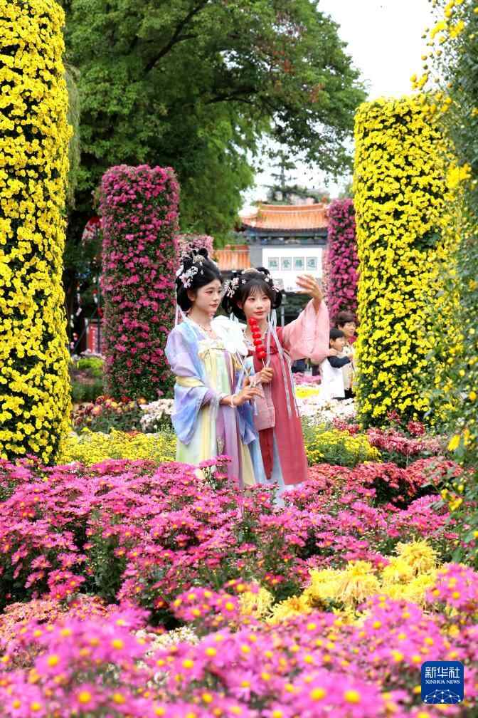 10月18日,游客在河南省开封市龙亭公园内观赏菊花。