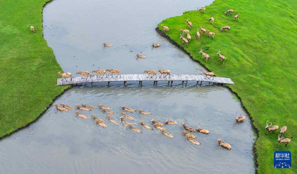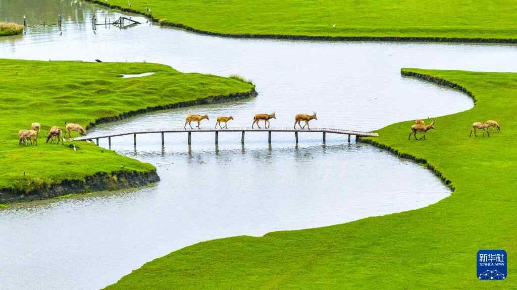 10月17日,在江苏省泰州市姜堰区溱湖国家湿地公园,一群麋鹿通过独木桥(无人机照片)。