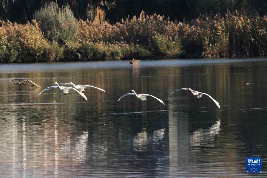10月17日在甘肃省张掖市国家湿地公园鹤影湖拍摄的白天鹅。