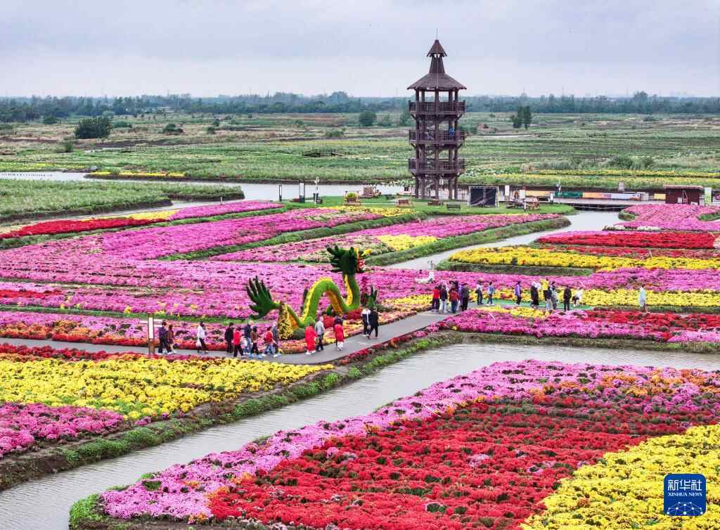 10月17日,游客在江苏省昆山市开发区慧聚花海赏花游玩(无人机照片)。