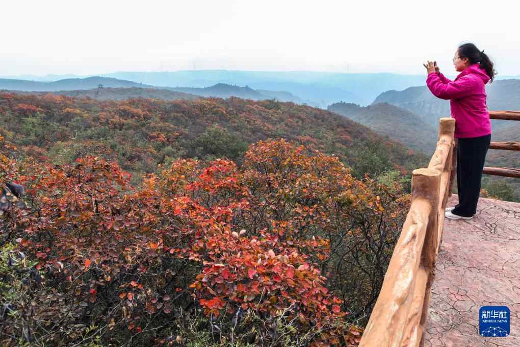 10月16日,在河南省焦作市博爱县青天河景区靳家岭上,游客在拍摄红叶美景。