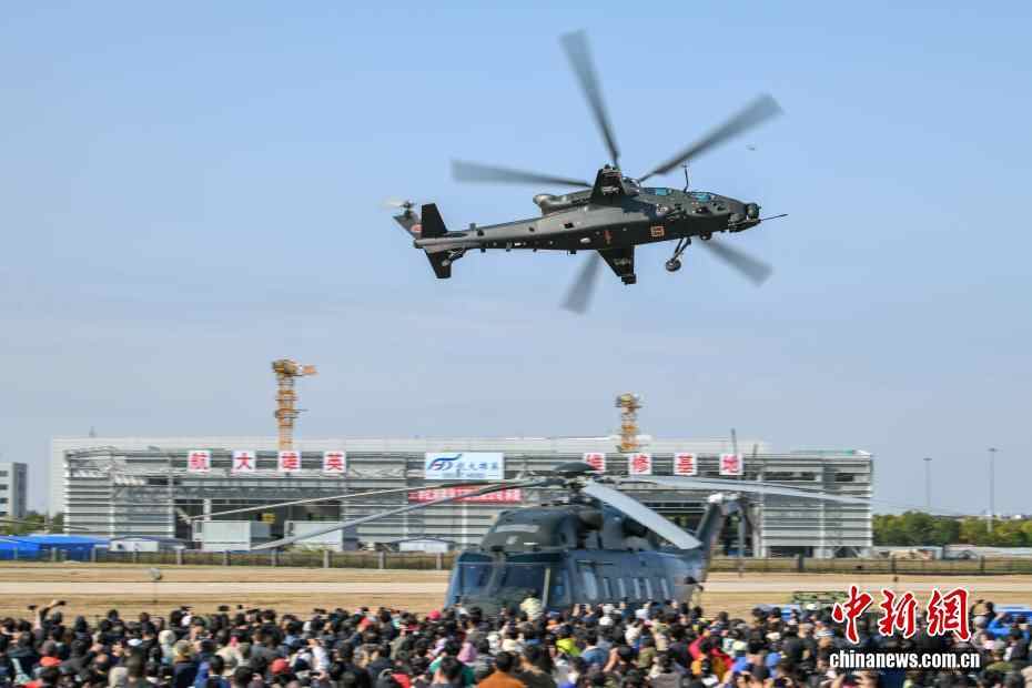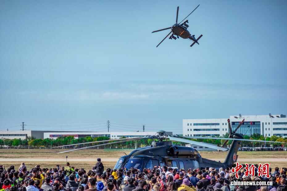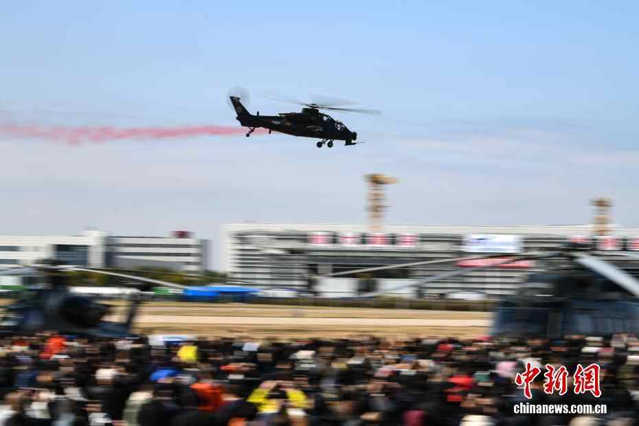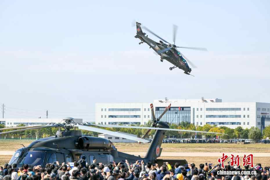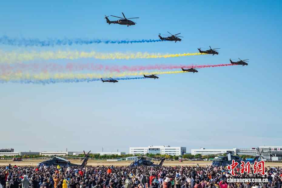 10月18日,天津,中国陆军“风雷”飞行表演队驾驶直-20T直升机为观众带来特技飞行表演。当日,第七届中国天津国际直升机博览会迎来公众日。