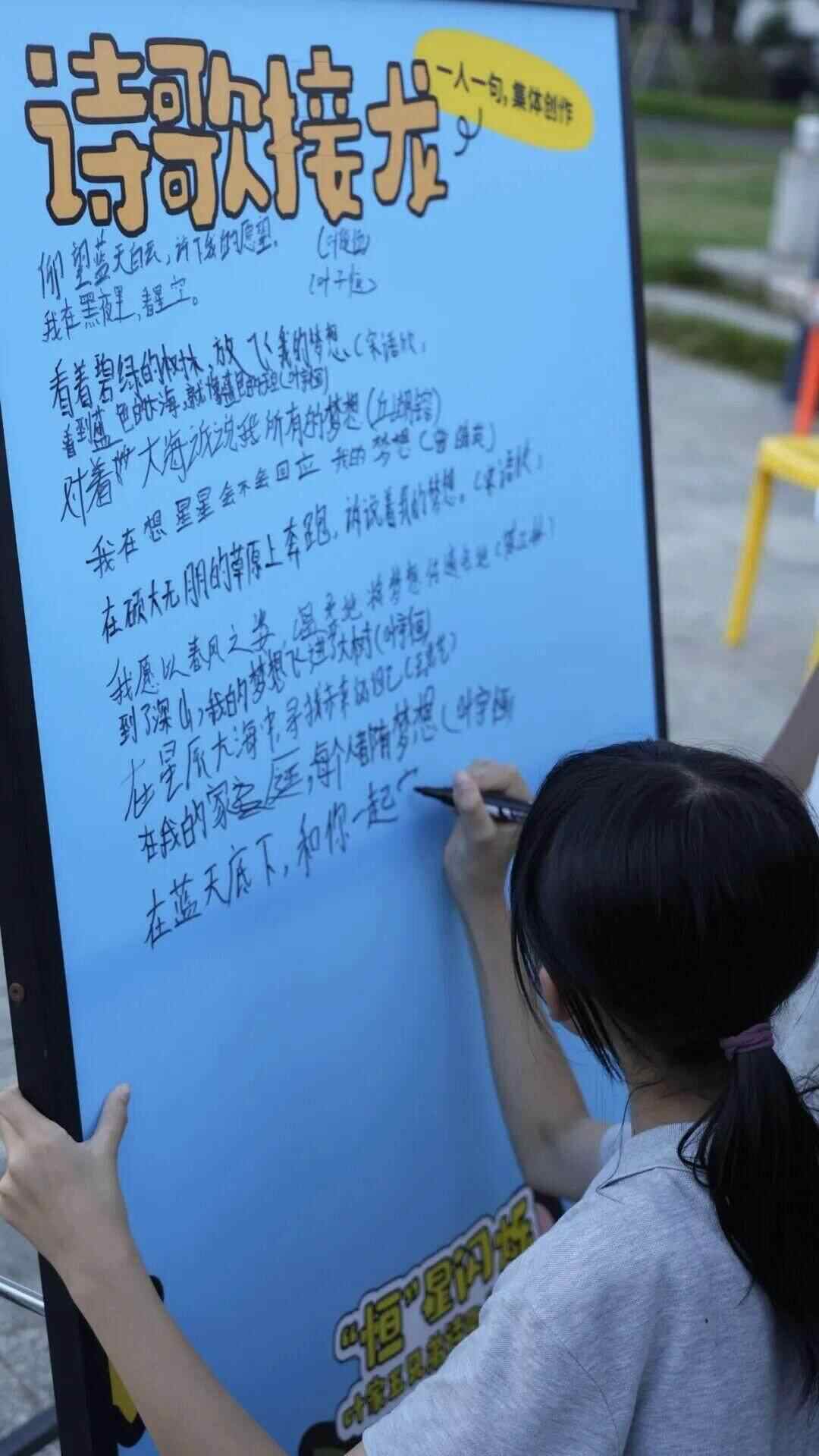 在随后的诗歌接龙中,孩子们书写着自己的梦想,一位80岁的老爷爷也欣然加入,与孩子们一起写诗。在欢声笑语中,诗会慢慢落下帷幕,仿佛所有诗句都化作了星光,点亮了这个平凡的午后。