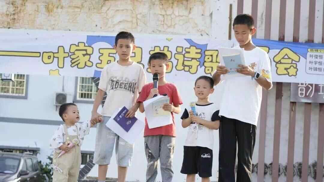 朗诵会现场,五兄弟共同登台,携手朗诵了大哥叶俊恒创作的诗歌《乌鸦》。孩子们的声音虽显稚嫩,却饱含真挚的情感,一句句诗行如同清澈的溪流,飘荡在公园的上空,感染着现场的观众。