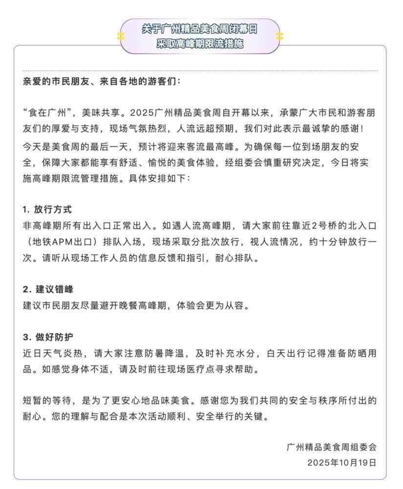 《关于广州精品美食周闭幕日采取高峰期限流措施的温馨提示》表示:“10月19日是美食周的最后一天,预计将迎来客流最高峰。为确保每一位到场朋友的安全,保障大家都能享有舒适、愉悦的美食体验,经组委会慎重研究决定,今日将实施高峰期限流管理措施。”