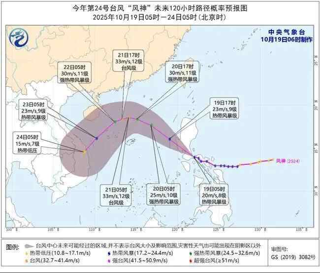 大风预报:受冷空气和“风神”的共同影响,19日08时至20日08时,台湾海峡、巴士海峡、南海北部和中部、西沙群岛、中沙群岛及黄岩岛附近海域、北部湾、琼州海峡、东海西部、浙江沿海、台湾沿海、福建沿海、广东沿海、广西沿海、海南岛沿海将有6-8级大风,阵风9-10级,其中东海西部、浙江沿海、台湾海峡、台湾西部沿海、福建沿海、广东东部沿海和南海东北部的部分海域风力有9-10级,阵风11-12级。