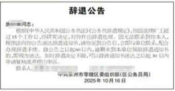 10月17日,中共永州市零陵区委组织部在当地媒体发布《辞退公告》:“唐某某同志,根据《公务员法》《公务员辞退规定》,你因连续旷工超过15个工作日,经研究决定,对你作出辞退处理。”