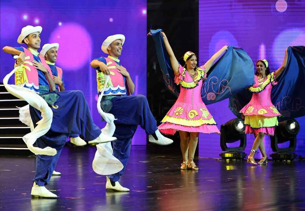 10月16日,哥伦比亚国家民间舞蹈团在表演舞蹈《昆比亚舞》。