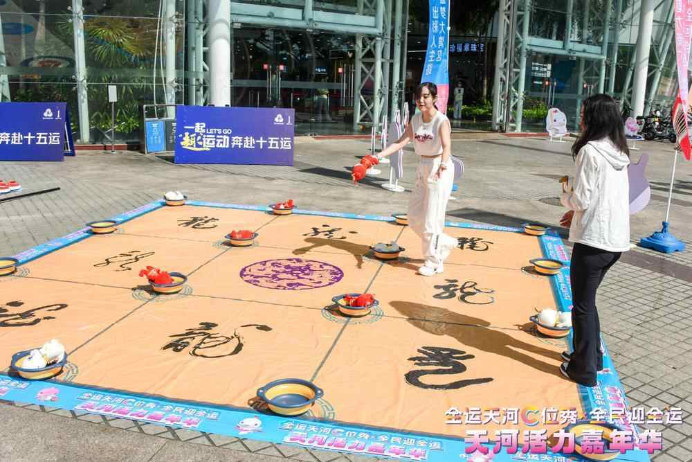 除了精彩表演,现场还有丰富的体育互动体验。迷你运动会人气持续攀升,旱地冰壶、两人三足、智力拔河等趣味项目陆续展开,吸引众多亲子家庭与年轻人组队参与。参与市民在欢笑与汗水中感受运动的乐趣,完成挑战的市民还收获了全运吉祥物盲盒、徽章等精美周边。