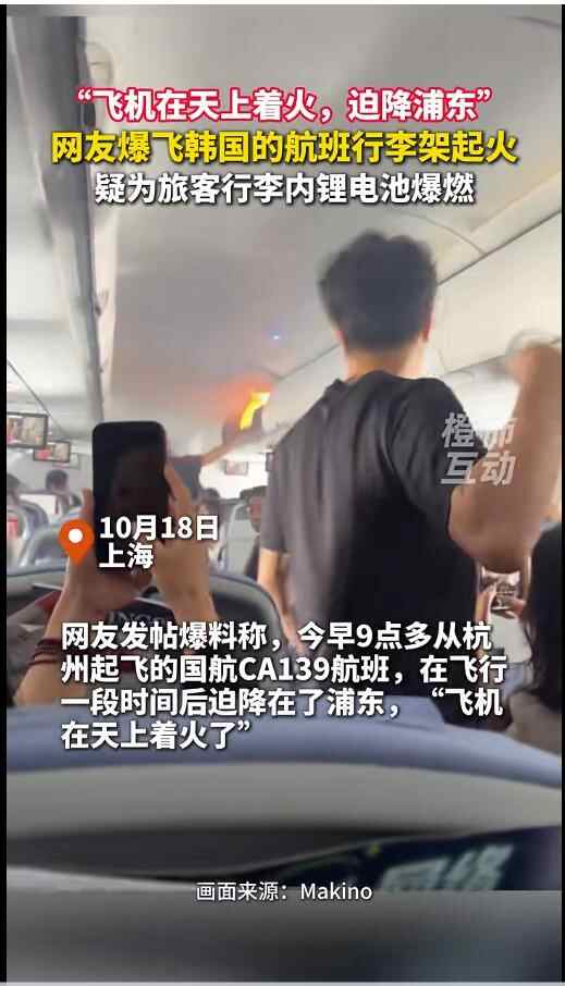 据都市快报此前报道,18日中午,有网友发文称,杭州飞往韩国的国航航班上,行李架突然着火,航班紧急备降上海浦东。