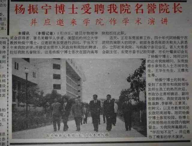 每年在香港中文大学讲学3个月的杨振宁,与东莞籍企业家、香港协成行集团主席方润华同为当时的香港中文大学校董。接受方润华的邀请,杨振宁从香港坐船到虎门,再乘一个多小时的汽车,抵达东莞理工学院。