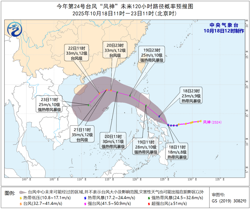 位于菲律宾以东的热带低压,已在10月18日凌晨加强为今年第24号台风“风神”(英文名:Fengshen;名字来源:中国;意义:神话中的风之神)。气象部门预计,“风神”结合中等强度冷空气,将自19日起为广东带来降温天气。其中21日广东各地的最高气温,或全面下降至30℃,粤北市县或进一步下降到介于15℃~20℃。