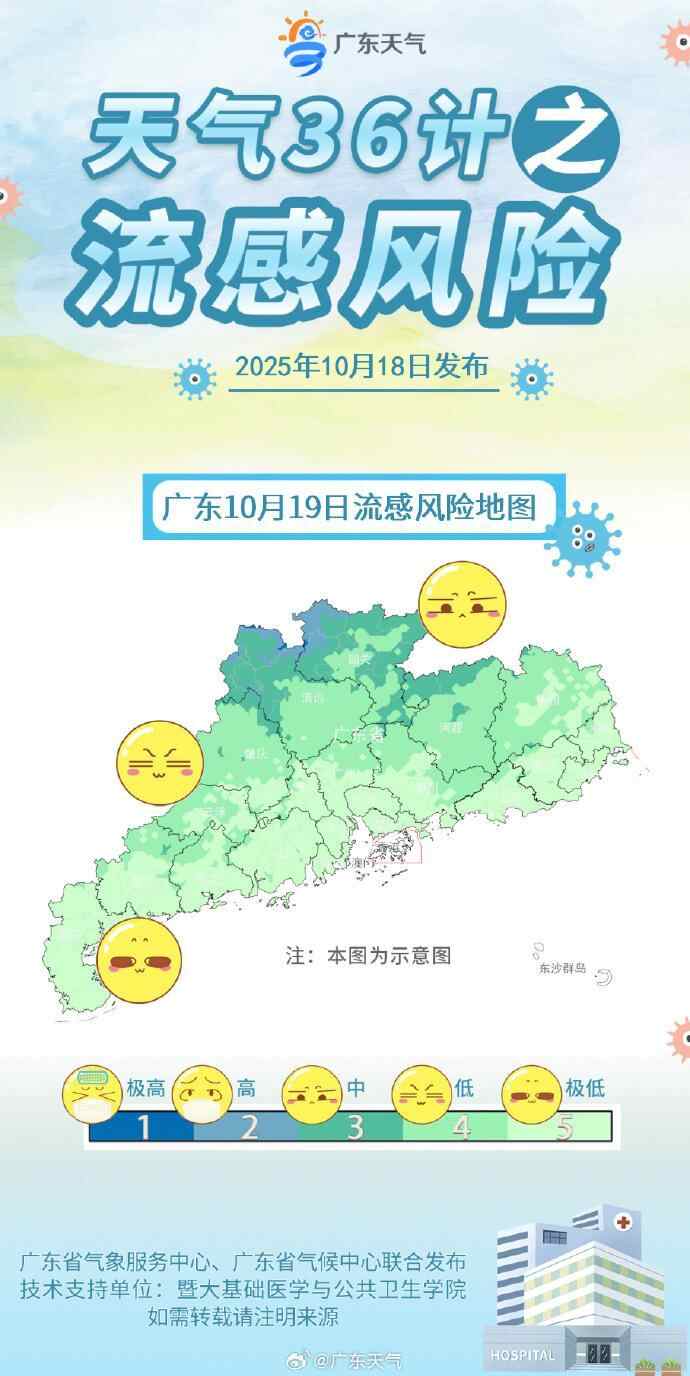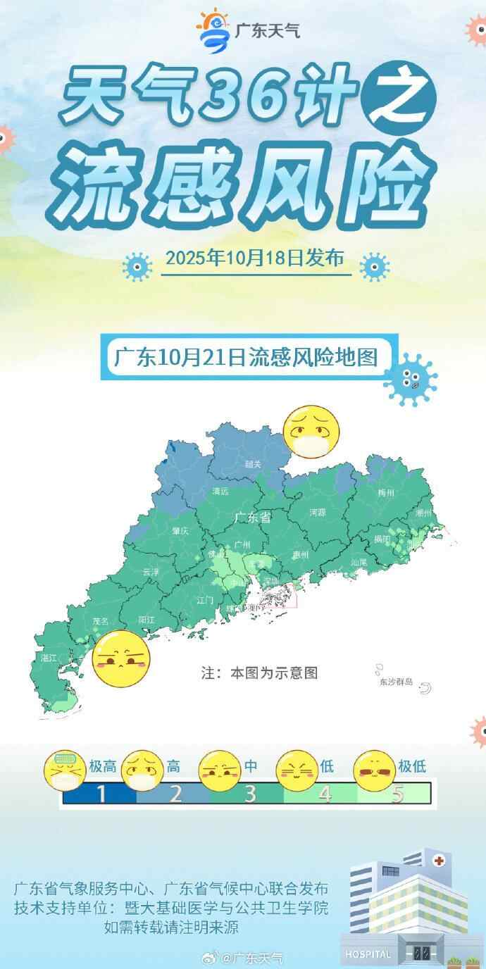 由于预计台风叠加冷空气,将为广东带来一轮明显降温天气,广东省气象部门在10月18日午间发布流感风险地图,预计19日至21日,肇庆、清远、韶关、河源、梅州等市,气象条件将导致流感风险处于高水平,部分时段和地区有可能达到极高风险。