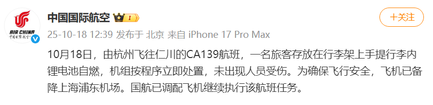 10月18日12时39分,中国国际航空发布情况通报,称当日由杭州飞往仁川的CA139航班,一名旅客存放在行李架上的手提行李内锂电池自燃,机组按程序立即处置,未出现人员受伤。为确保飞行安全,飞机已备降上海浦东机场。国航已调配飞机继续执行该航班任务。