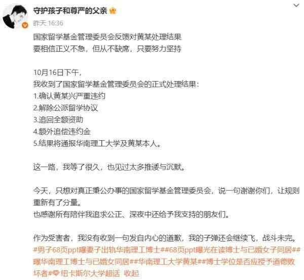 10月16日下午,发布PPT的当事人张先生表示,国家留学基金管理委员会已向他反馈对黄某的处理结果。