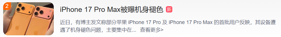 随后,“iPhone 17 Pro Max被曝机身褪色”冲上热搜第二。