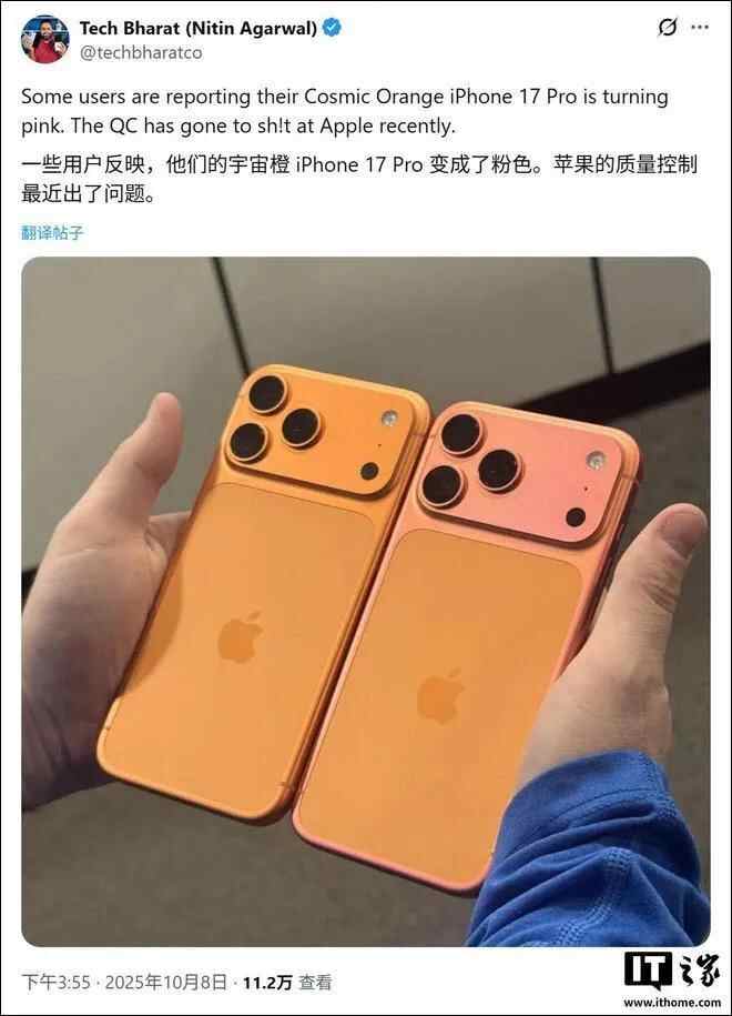 关于褪色原因,许多受影响的用户推测与紫外线有关。他们表示,在将手机短暂置于阳光下之后,便观察到了明显的褪色现象。部分用户甚至调侃称,只需将“星宇橙”版 iPhone 17 Pro 放在太阳下晒一会儿,就能免费获得一台独特的“玫瑰金”版手机。