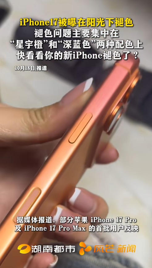 今天(10月18日),科技媒体 GSMArena 发布博文,称部分苹果 iPhone 17 Pro 及 iPhone 17 Pro Max 的首批用户反映,其设备遭遇了机身褪色问题,主要集中在“星宇橙”和“深蓝色”两种配色上。