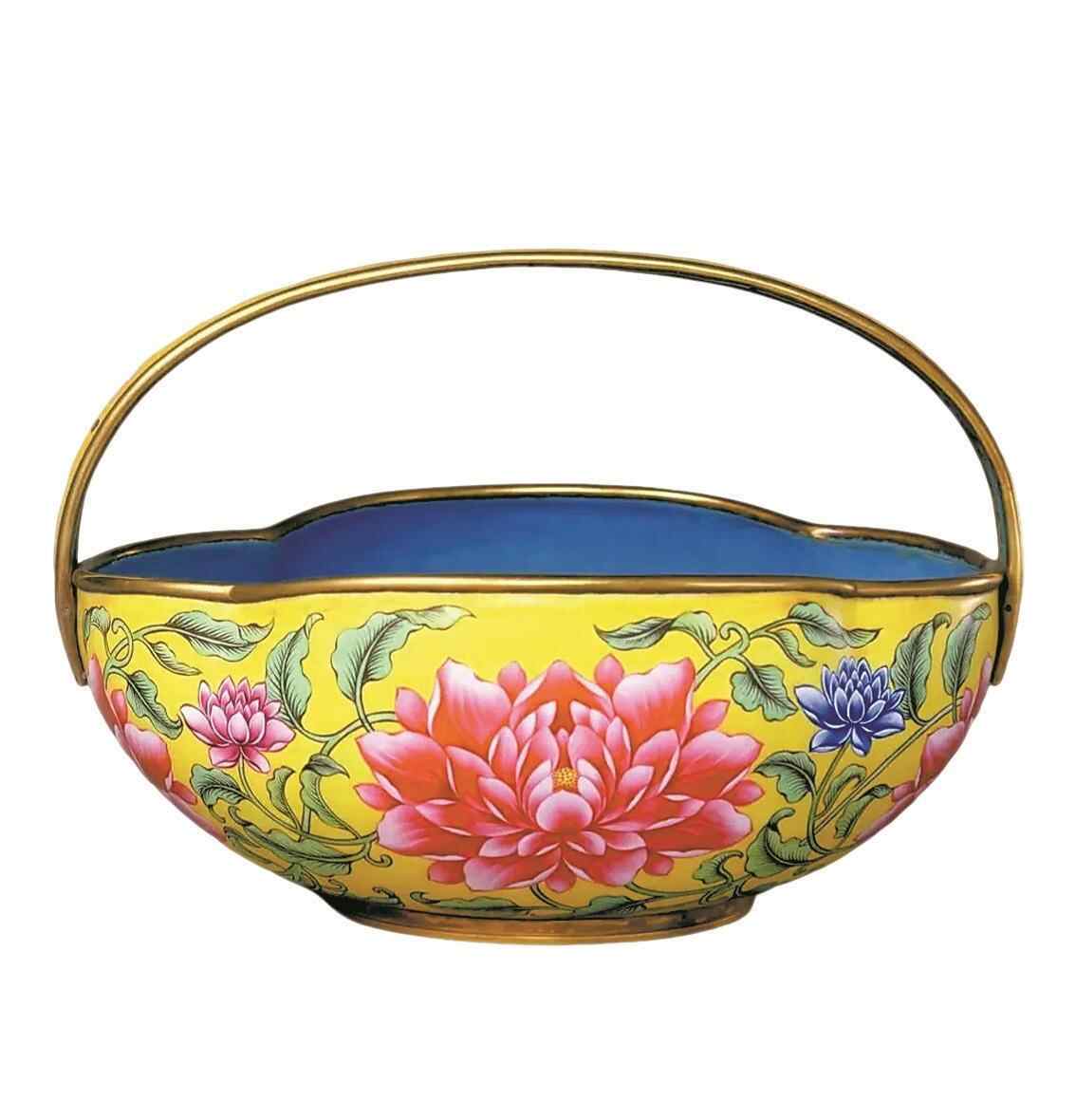 清乾隆四十年(1775)十一月乾隆帝命人将十件康熙、雍正款画珐琅器送到广州,要求粤海关官员仿制这些器物并落“乾隆年制”款识。于是粤海关官员将器物画样后,把样稿交由法国及广州本地制作。之后,十件提档器物及制作的器物被送回宫廷。此花篮即为法国依据粤海关样稿制作而成。