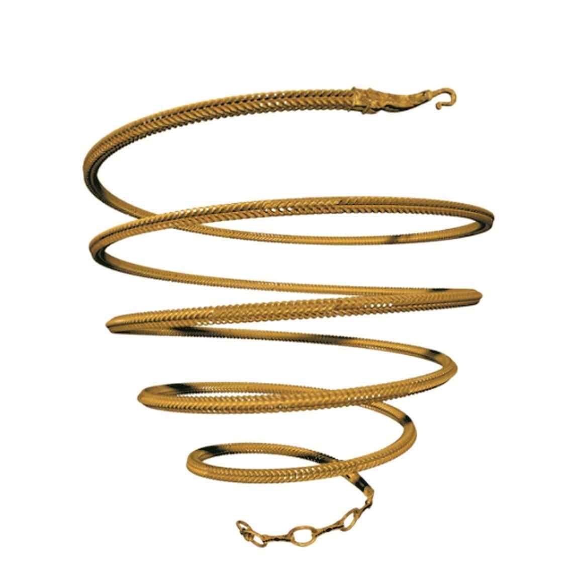 此金项饰是“南海Ⅰ号”沉船出水的第一件金器,具有明显的西亚风格。金项饰的带钩和搭扣有轻微的使用痕迹,表明它应该不是船上的货物,而是个人使用的金饰。它的主人可能是外宾或外商,身份尊贵且具有非凡的经济实力,当时正随船返回西亚地区。金项饰是海丝兼具贸易和文化交流双重属性的见证。