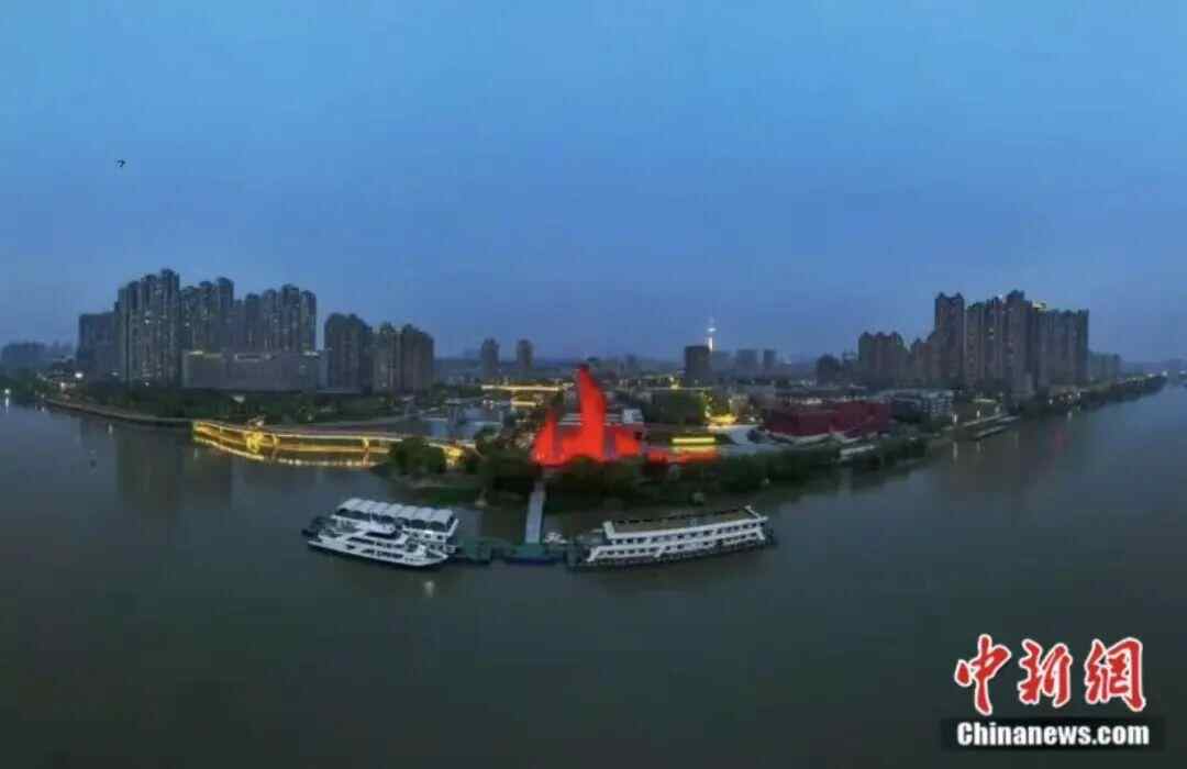 渡江胜利纪念馆红色的“千帆竞渡”群雕在暮色中分外醒目。中新社记者 泱波 摄