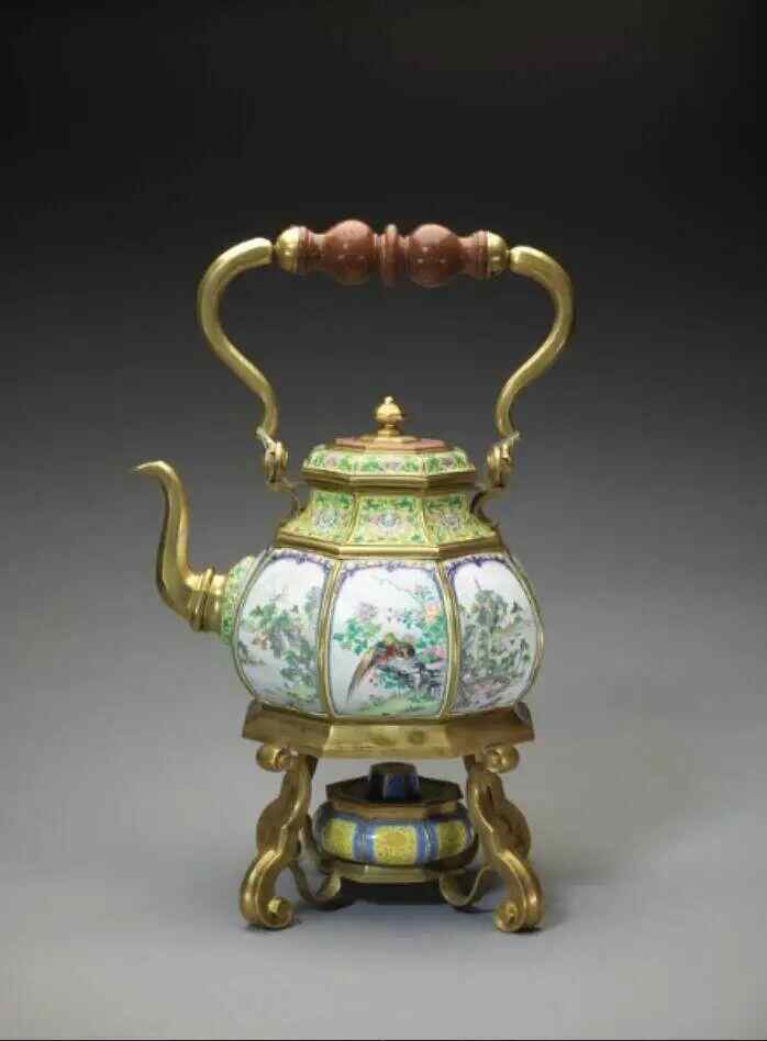 提梁壶铜胎鎏金,八棱形,腹部八面开光饰四季花鸟与山水图案。壶底施白珐琅釉,蓝珐琅双栏内署仿宋体“乾隆年制”竖行四字款。
