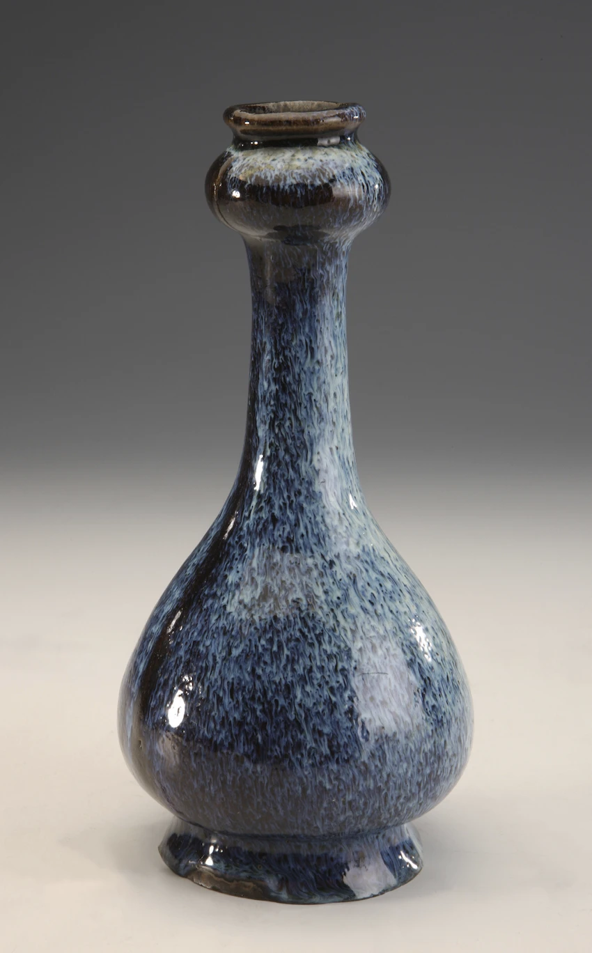 全器满施仿钧蓝色变釉,釉厚处呈月白色,釉面有细小开片。底部无釉,有旋削痕。此瓶有元代遗风,为石湾窑明代早期艺术陶器珍品。