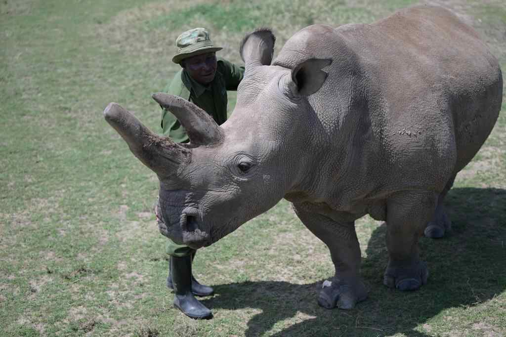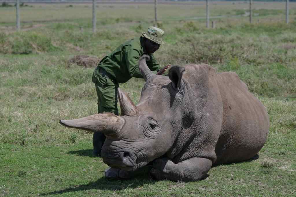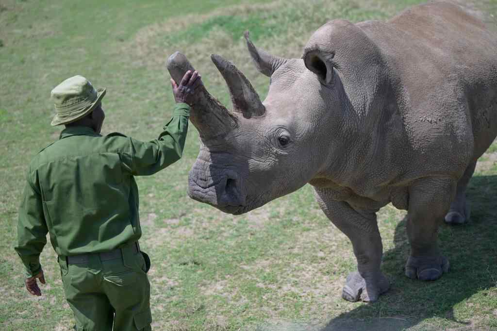 10月7日,在肯尼亚中部莱基皮亚郡奥尔佩杰塔自然保护区,工作人员与雌性北方白犀牛“娜金”互动。