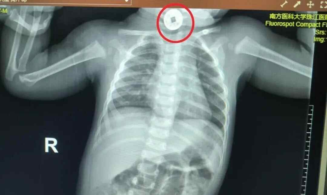 医护人员立刻启动紧急检查:通过影像学确认,一枚直径约2厘米的圆形祈福币卡在宝宝食道上段,距离咽喉仅3厘米。