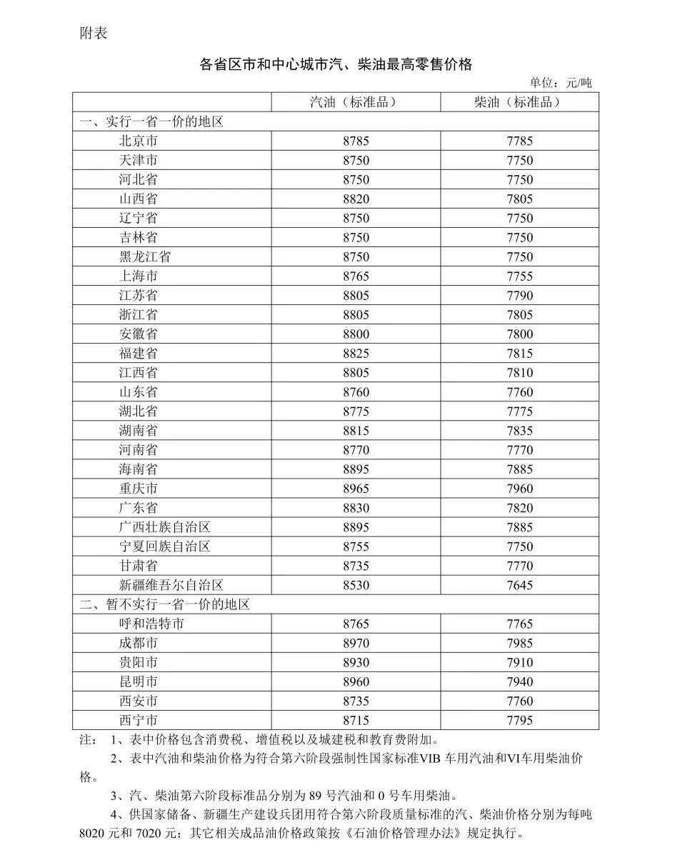 附:各省区市和中心城市汽、柴油最高零售价格