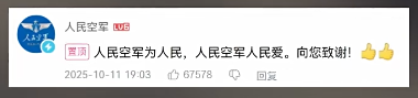 10月11日,官方账号@人民空军 在视频平台看到这则视频后,留言致谢:人民空军为人民,人民空军人民爱。向您致谢!