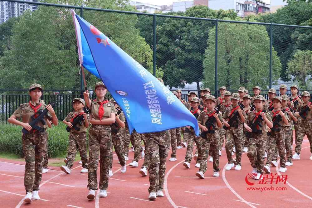 “砰!”随着火箭筒飞向空中炸开,火圈在操场两侧熊熊燃起,身着迷彩服的少先队员们进入了模拟战场,开展模拟拯救人质军事训练与展示。现场还展示了《旭・风华正茂》《刺杀操》《旗武少年行》《应急棍》等多项节目,一招一式中满是少年锐气。