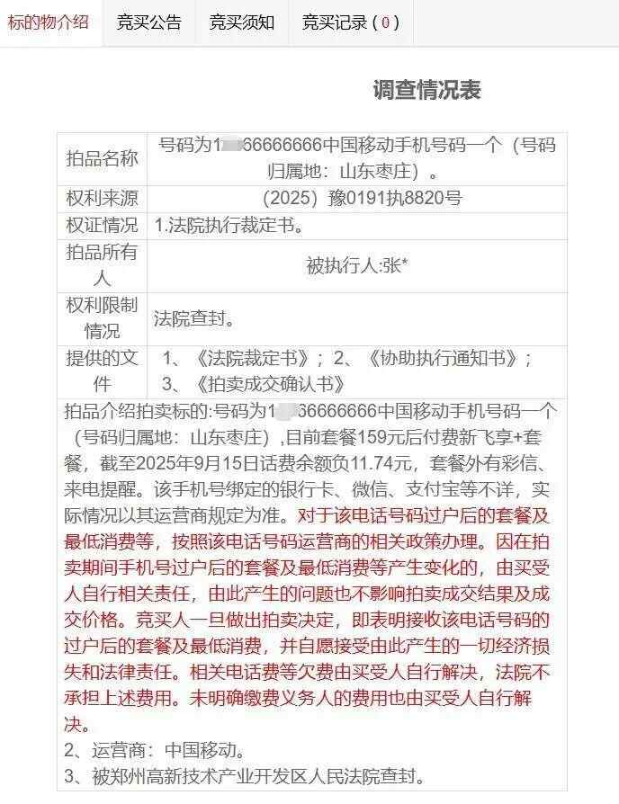 阿里资产平台对该标的物的介绍显示,号码为1**66666666的中国移动手机号码归属地为山东枣庄,该拍卖系司法拍卖,将于10月16日起拍,处置法院为河南省郑州高新技术产业开发区人民法院。