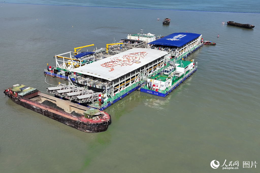 太湖是长江流域的一部分,9月23日下午,记者从江苏无锡宜兴城东港码头搭乘交通船,向太湖深处驶去。20分钟后,蓝白相间的“钢铁矩阵”映入眼帘——管道纵横交错,监控屏蓝光闪烁,各式机械紧密排布,宛如一座漂浮在水面上的“移动工厂”。这是我国自主研发、拥有完全自主知识产权的世界首创生态清淤平台“太湖之光”。目前,它已在太湖“啃泥”一个多月。如今“太湖之光”每天能清理8000立方米淤泥,未来6年,它将给太湖做一次深度清洁,总清淤量能装满4000个游泳池。人民网记者 余乐摄