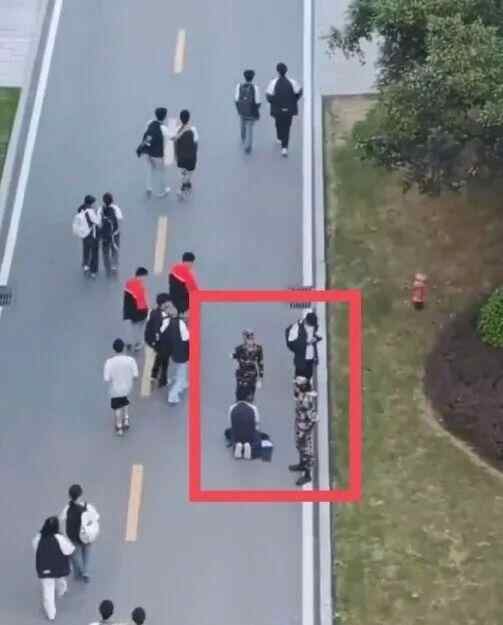 据介绍,身穿迷彩服的是学校纠察队的队员。一名同学违规携带充电宝被发现后情绪激动,想要通过下跪的方式博取同情,以此逃避处罚。