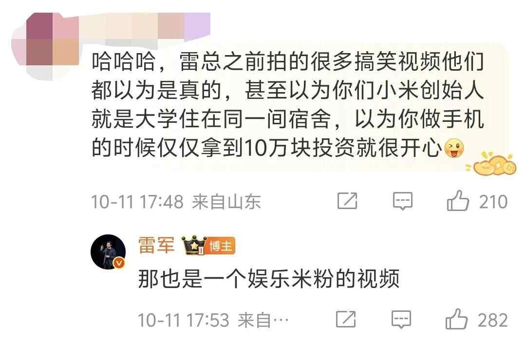 后续有网友在雷军微博评论区下留言,“雷总之前拍的很多搞笑视频他们都以为是真的,甚至以为你们小米创始人就是大学住在同一间宿舍,以为你做手机的时候仅仅拿到10万元投资就很开心。”
