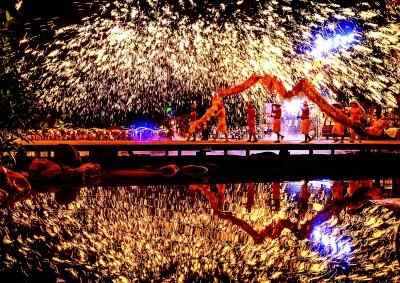10月5日,在四川省成都市双流区黄龙溪古镇,民间艺人表演非遗“火龙灯舞”。新华社发