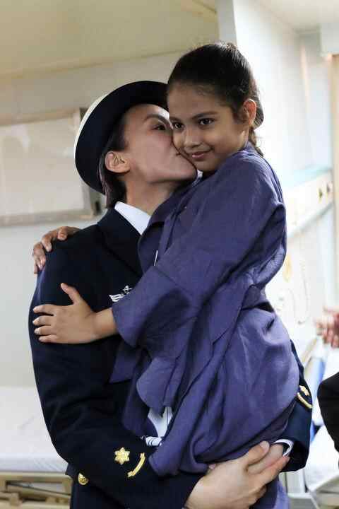 2019年12月9日,在中国海军和平方舟号医院船上,盛睿芳医生亲吻孟加拉国的9岁女孩沁。新华社发(吴炜权 摄)