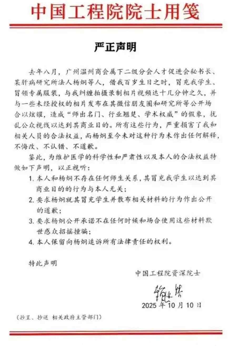 公众关注这场纠纷,是震惊于钟院士以百岁高龄亲自维权,更是怕“傍权威”的歪风侵蚀社会信任。这些年,从钟南山院士照片被用作产品宣传,到张伯礼院士遭虚假养生科普碰瓷,类似“傍权威”换取个人或商业的利益的事件屡见不鲜。尤其杨炯身后有肝病研究所和诊所,若合影被患者误读为“学术背书”,可能误导求医选择。这也是院士办公室声明里最忧心的:若这些照片视频被用于非法行医的宣传,将给公众信任造成极大的影响与危害。正因如此,查清事实不只是为双方辨清白,更是为守住公众对学术权威的信任底线。