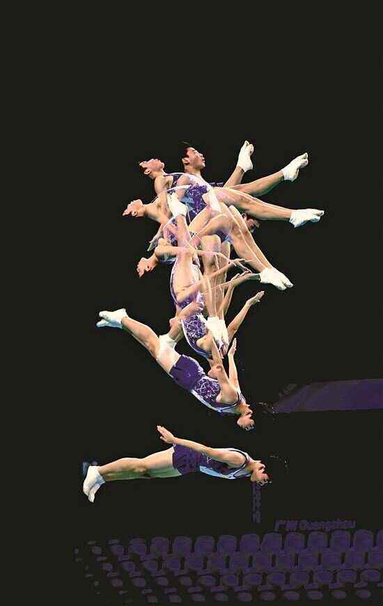 ■蹦床运动员比赛中(多重曝光)。新快报记者 观显锋 郭思杰/摄