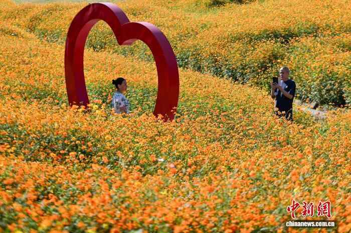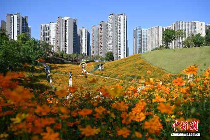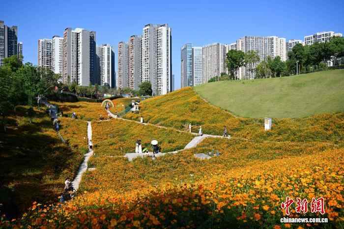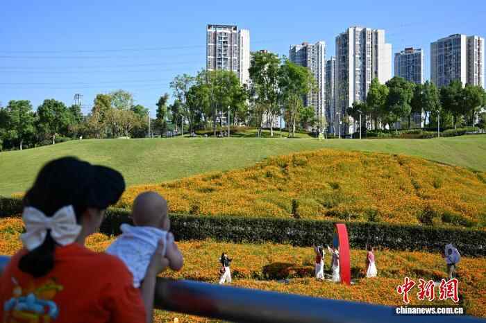 10月10日,市民在重庆溉澜溪体育公园赏花、游玩。中新社记者 何蓬磊 摄