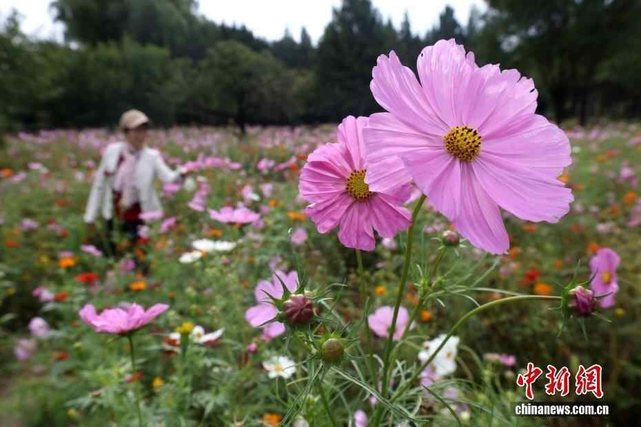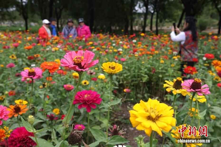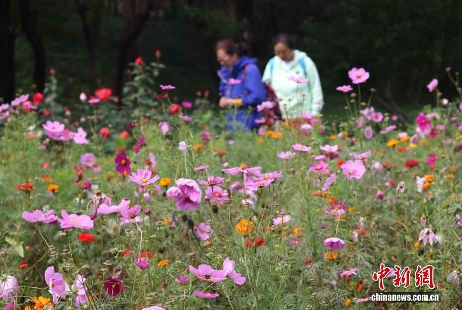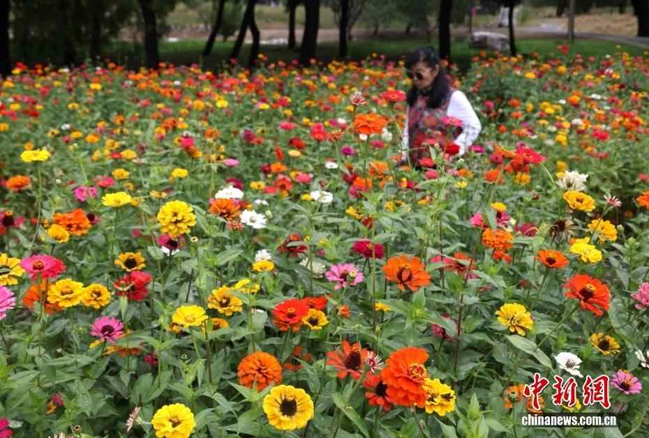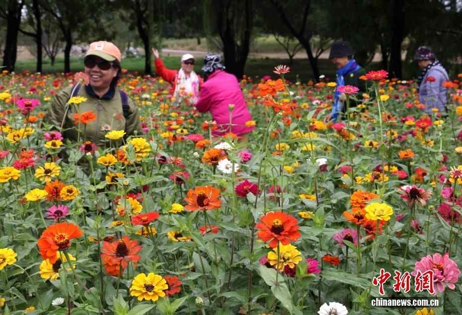 10月10日,游客陶醉在圆明园藻园花海中。近日,北京圆明园遗址公园的藻园花海迎来最佳观赏期。百日菊、黄秋英等花卉争相盛开,上演秋日浪漫。