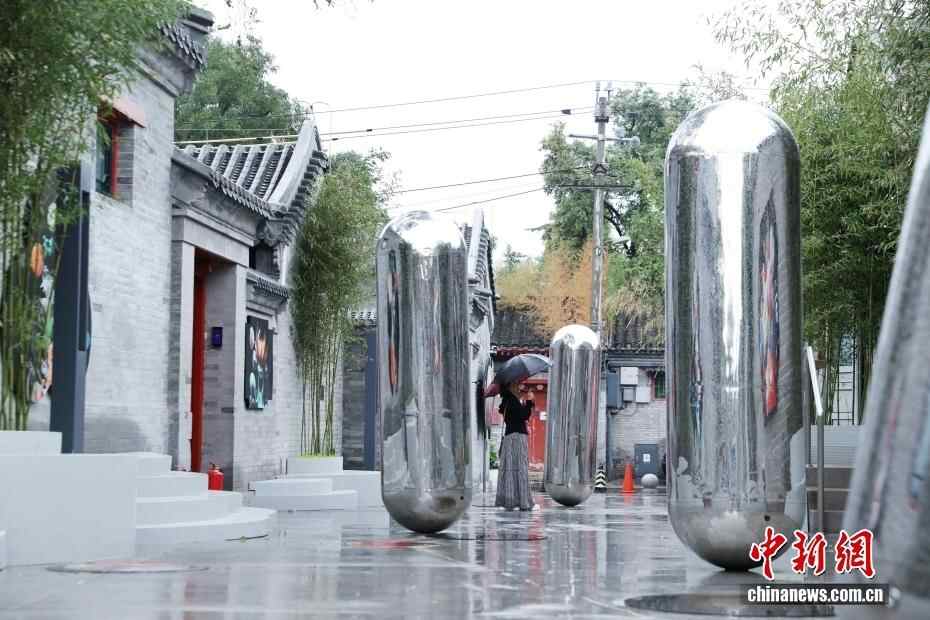 10月10日,北京三眼井胡同,展览中的半月形镜面吸引游客。《镜观·曼波》正在北京胡同美术馆展出。